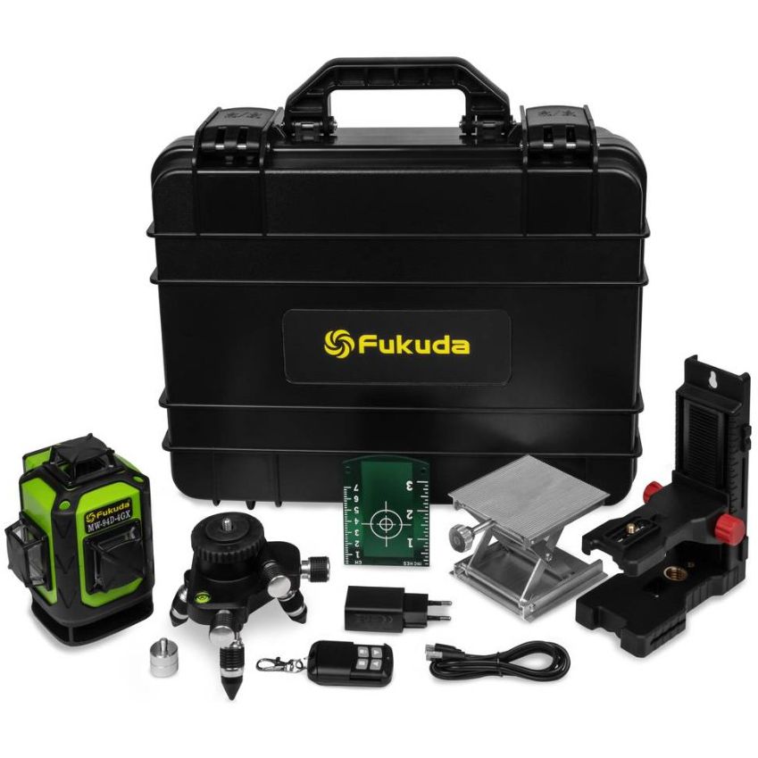Лазерный уровень Fukuda MW-94D-4GX PRO - профессиональный инструмент для точного выравнивания и нивелирования в строительстве и отделке. Используется для установки горизонтальных и вертикальных линий при монтаже перегородок, облицовке стен, укладке плитки и других задачах, требующих высокой точности разметки.