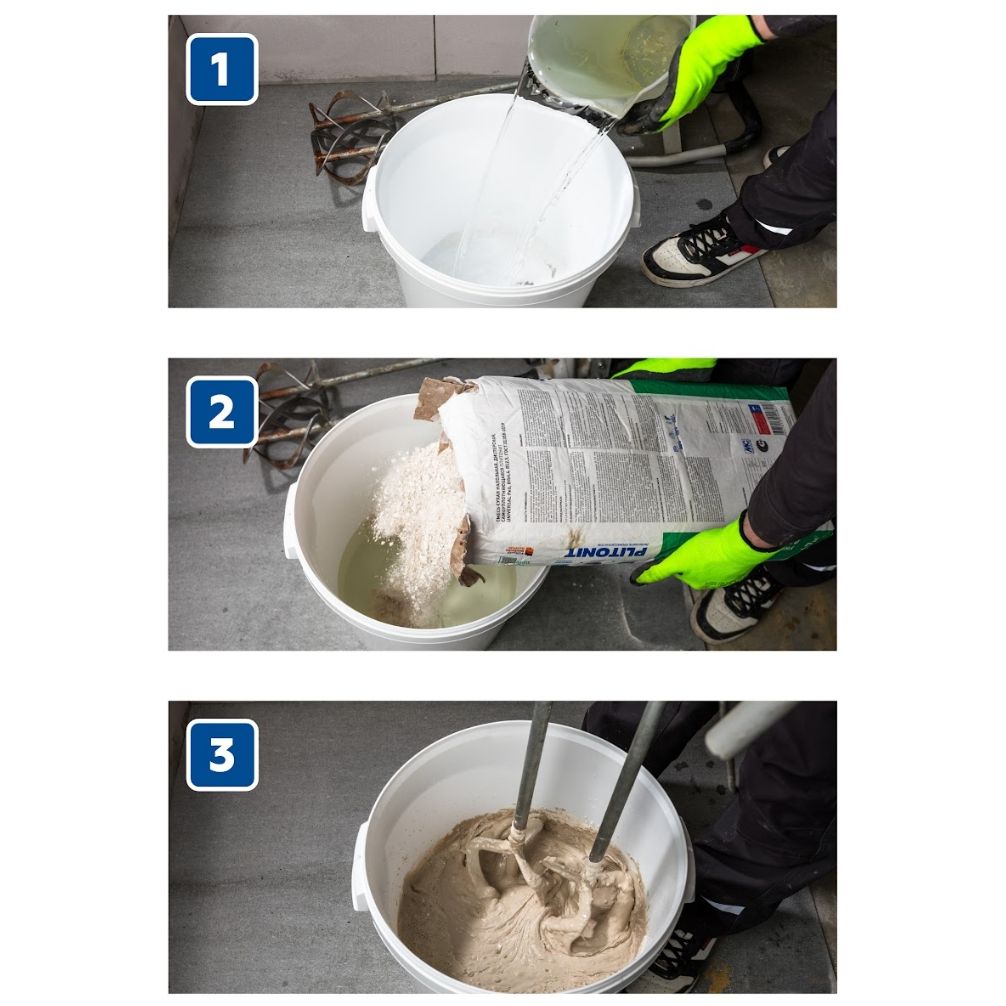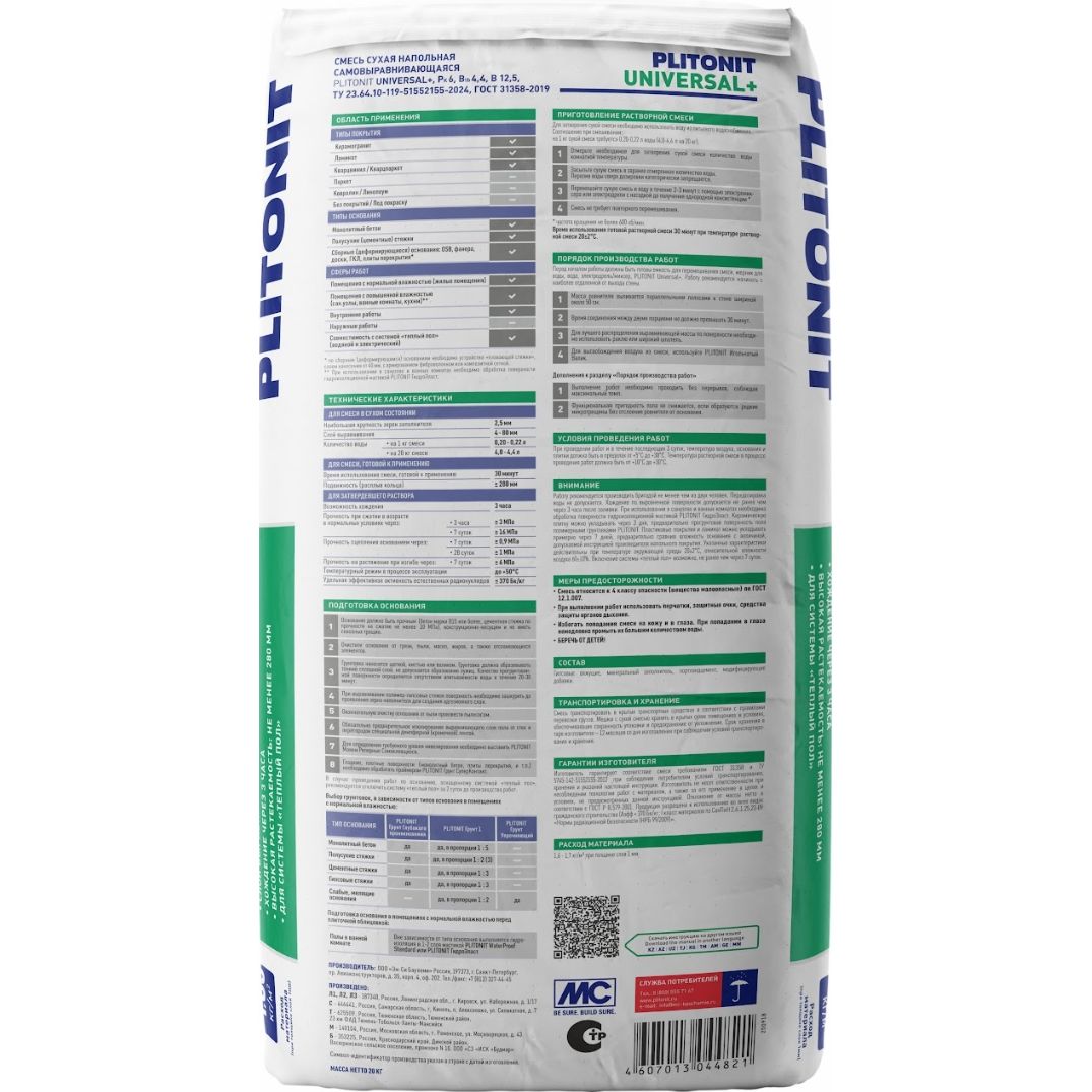 Плитонит Universal поставляется в упаковке по 20 кг, что делает его удобным для транспортировки и хранения. Смешивание с водой происходит легко, а полученная смесь обладает высокой текучестью, что обеспечивает равномерное распределение по поверхности.
